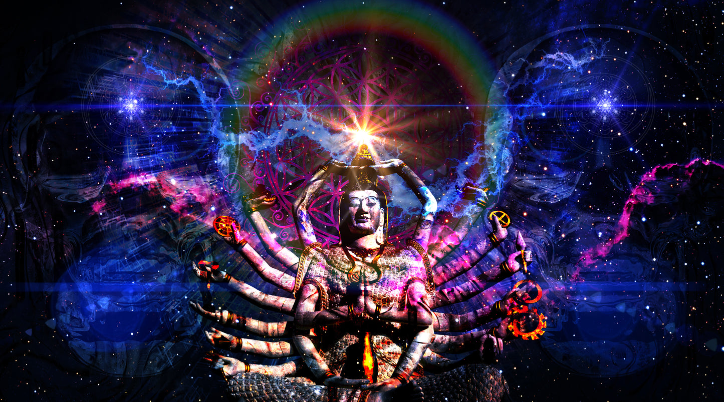 Here, the deity's manifold arms reach out into the void, each limb a testament to the myriad forces at play in the cosmos. The skulls, silent sentinels to the endless cycles of life, whisper the esoteric knowledge that existence is a continuum, a passage through various states of being, where each end is but a prelude to a new genesis.